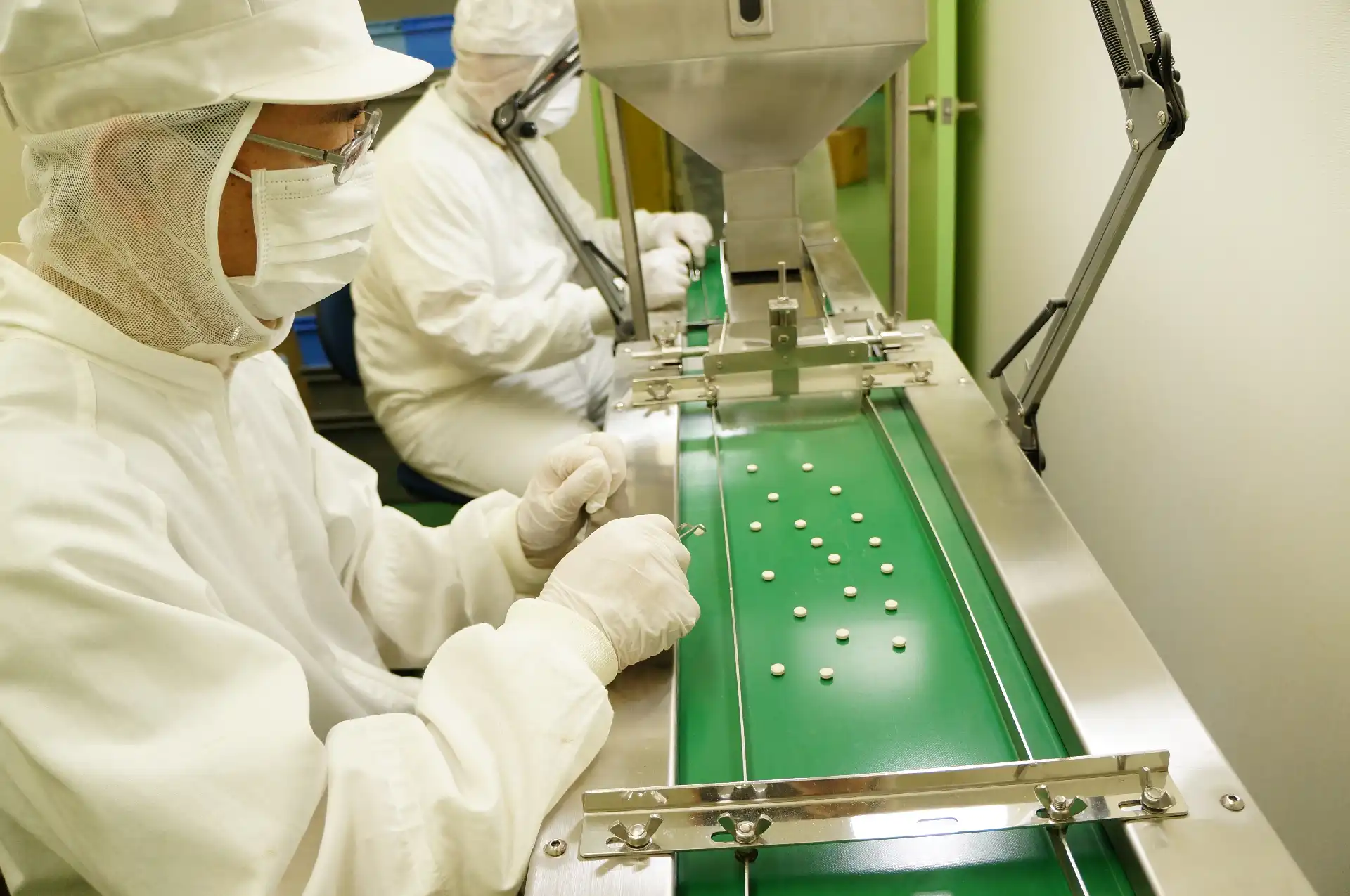 原材料を加工し、粉末や錠剤などの形状にし、そこから袋に詰めたり、箱に入れたり、包材に小分けしたりなど、最終完成形まですることが可能です。